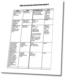 Credit Bureaus, Creditors and Collection Agencies have specific laws they must abide by. When they violate them, Federal Law provides relief for each infraction. You will find listed each infraction, its corresponding law regulation code and $ amount per day you can recover.