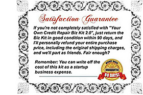 As mentioned above, I personally guarantee that if at any time within 90 days, you're not completely satisfied with your Credit Repair Biz kit, just return it in good condition and I'll personally refund the entire cost of the Biz Kit, including the original shipping charges, and we'll part as friends.